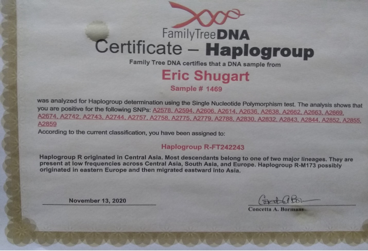 2002 DNA testing of Eric and Bill shows a 24 out of 25 marker match,indicating a high liklihood that Bill's John and my ZAch were brothers..