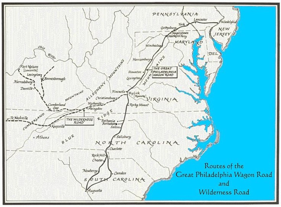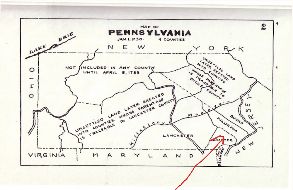 Concord Township (red arrow), where my American heritage begins was at the edge of the wilderness. The Pennsylvania map of 1730 shows much unsettled territories. (Concord Township was contained in Chester County until 1789). Colonists knew little of the interior of the continent to the west of the Appalachians and south of the Great Lakes.
