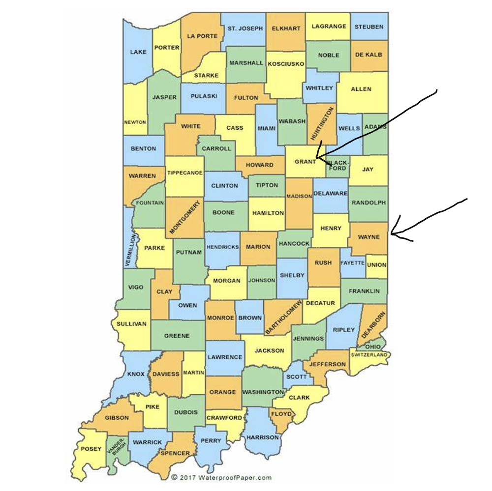 Around 1800, my g-g-g-g- grandfather George, son of Zachariah (and grandson of Old John), moved to Grant County, Indiana. In 1835, George's son John moved 160 miles northwest to Wayne County. From 1835 until the late 1940's, all my paternal Shugart grandparents remained in Wayne Co. Indiana.
