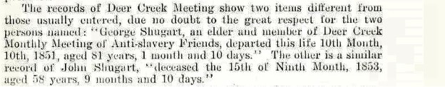 !GENEALOGY: This John is almost certainly connected to the earlier Johns in the Quaker record s (see below) and is likely a grandson of the Zachariah Shugart who died in Lancaster Count y PA in 1739, and at least a cousin to the John Shugart who, with his son Zachariah, moved t o NC and to the Zachariah Shugart and Peter Shugart in York County PA who moved to VA and M D respectively.